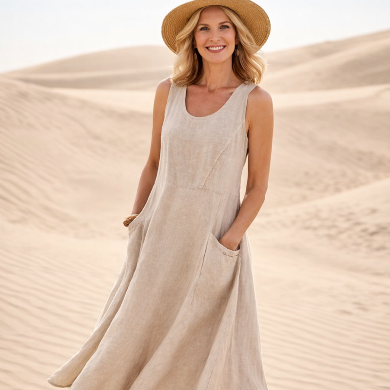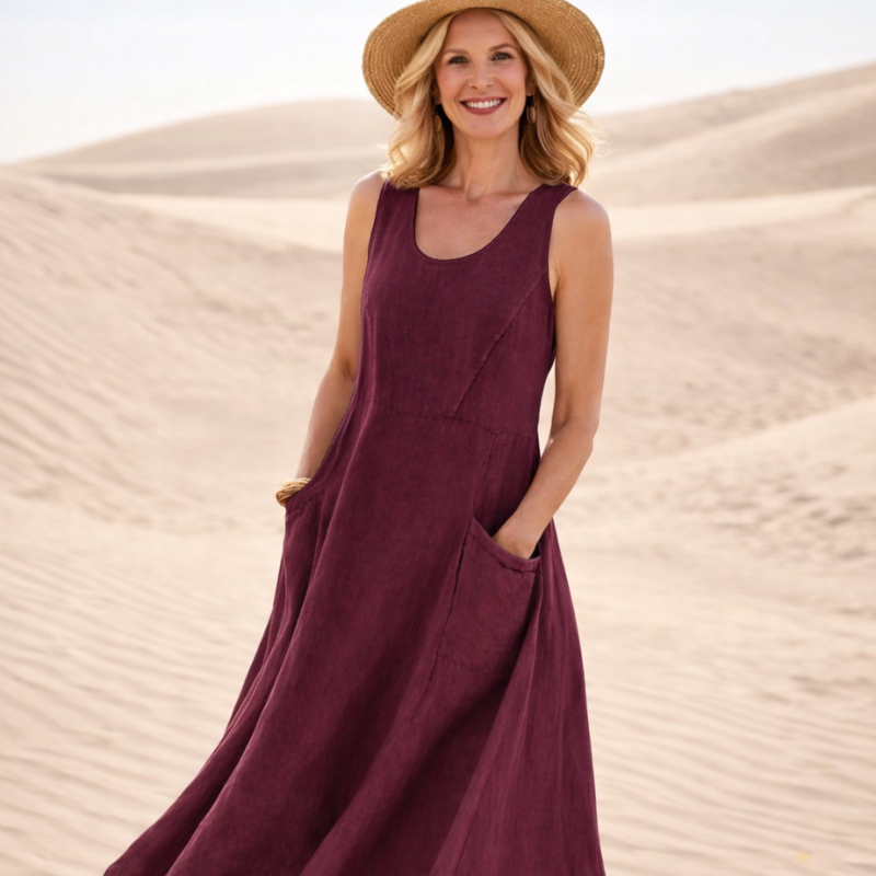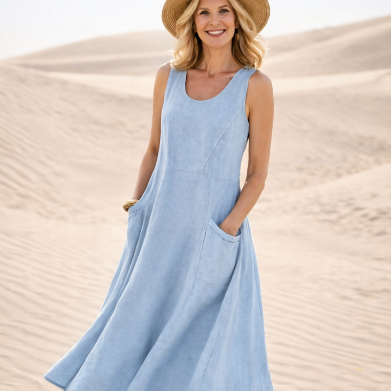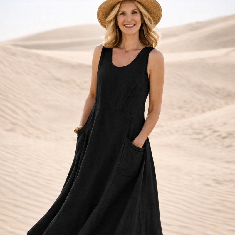 Du trenger en kjole som gir deg både komfort og eleganse. Med denne ermeløse maxikjolen får du en lett og luftig følelse som beveger seg naturlig med deg. Den avslappede passformen gir deg frihet og selvtillit hele dagen.