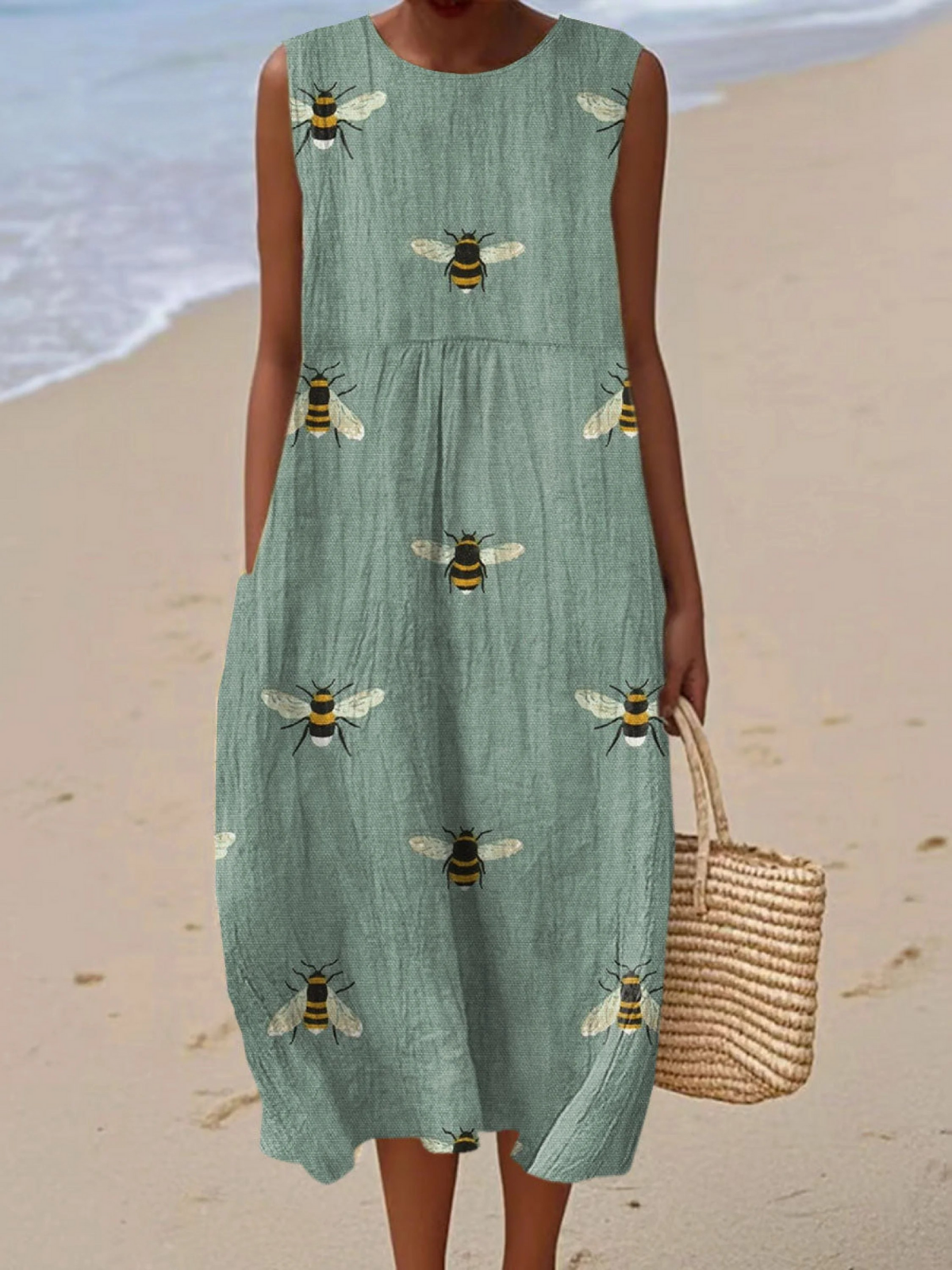 Denne ermeløse vårkjolen er laget av luftig, pustende stoff, og tilbyr en frisk vri på hverdagseleganse. Den er designet for å holde deg komfortabel når temperaturen stiger, og den flagrer uanstrengt samtidig som den opprettholder en ren, raffinert silhuett. Den er enkel å kle opp med sandaler eller avslappet med flate sko, og overgangen er sømløs fra dag- til kveldsbruk.