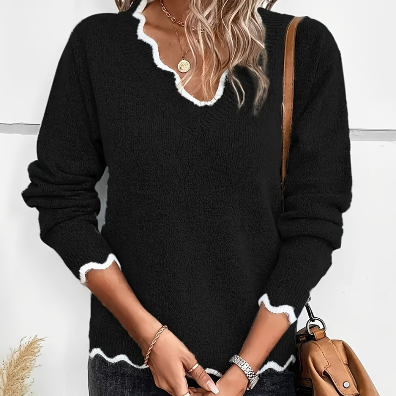 Du ønsker en genser som kombinerer komfort og eleganse. Denne modellen gir deg en smigrende V-hals og myk strikk, slik at du føler deg velkledd, varm og selvsikker hele dagen.