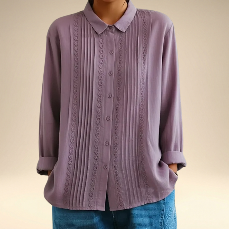 Denne skjorten har en sofistikert plissert front med delikate blondedetaljer som gir et eksklusivt uttrykk. Den klassiske kragen og knappelukkingen foran skaper en ren og stilfull silhuett som passer til både jobb og fritid. Den løse passformen gir deg behagelig komfort hele dagen, samtidig som designet fremhever en feminin og raffinert stil. Perfekt å kombinere med jeans for en avslappet look eller med dressbukser for et mer formelt antrekk.